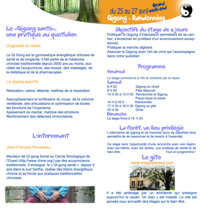 Dates:• Samedi 29 mars : Qigong : Prise de parole